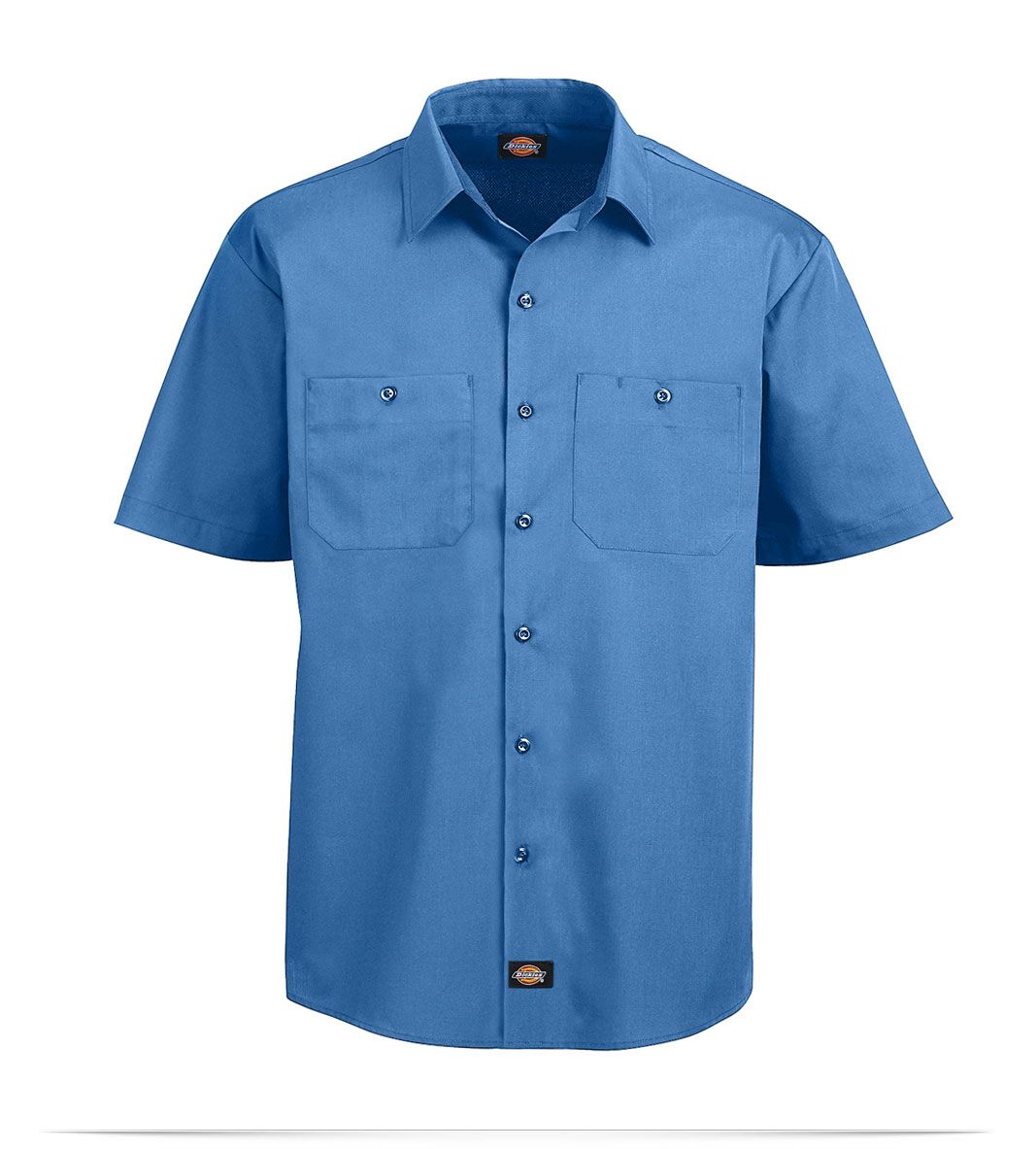 - Dickies logo on the side of the chest pocket and bottom of the button placket
