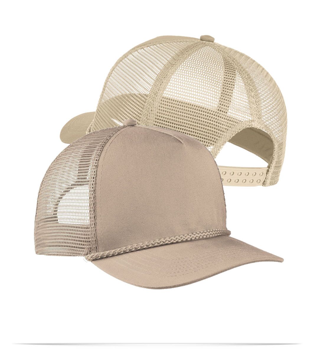 Fabric: 100% cotton front panels, 100% polyester woven mesh mid and back panels
