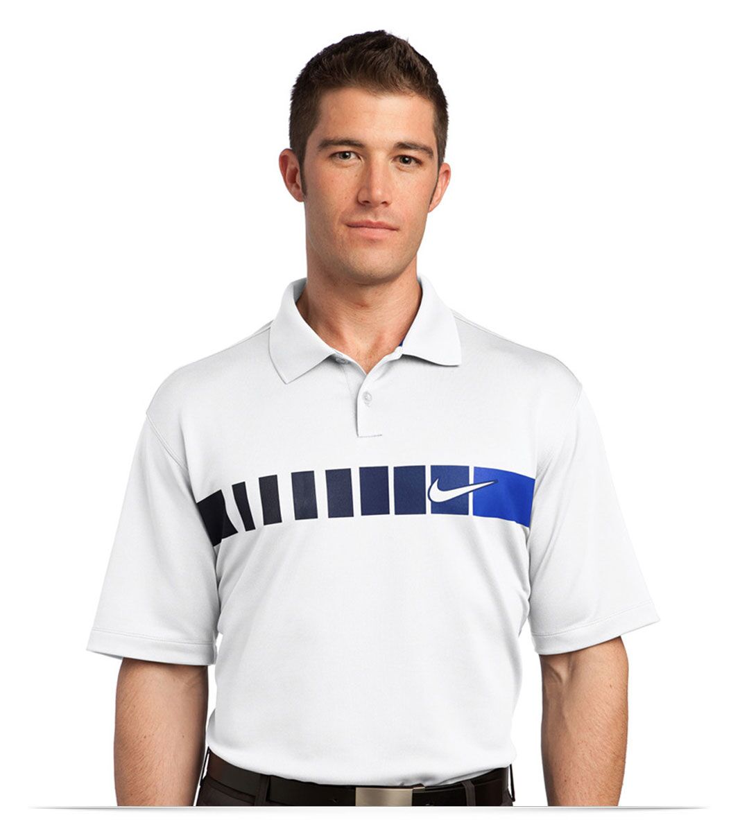 Nike Golf Dri-FIT Chest Stripe Print Polo pricing includes, your embroidered logo on one location with 8,000 stitches, your choice of up to 6 colors for a one time logo set-up fee of $65.00. For more info, please call us at (888) 475-5646.