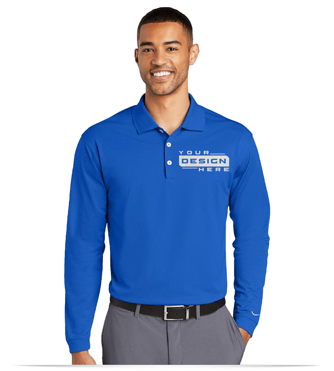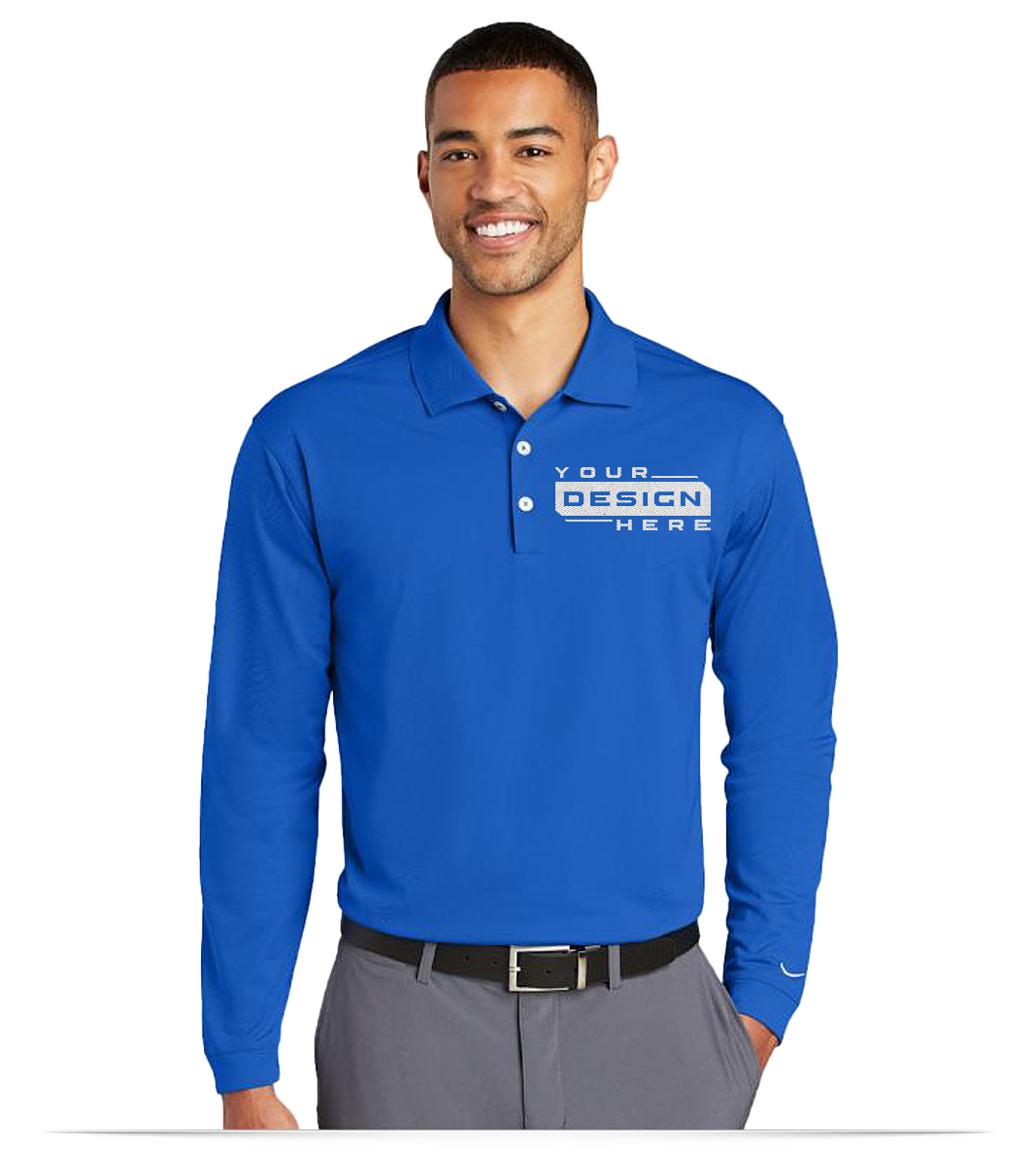 The Custom Nike Long Sleeve Dri-FIT Stretch Tech Polo pricing includes your embroidered logo in one location. It comes with 8,000 stitches. Choose up to 6 colors. And we have a one-time logo set-up fee of $65.00. For more info, please call us at (888) 475-5646. So, what are you waiting for? Buy now!
