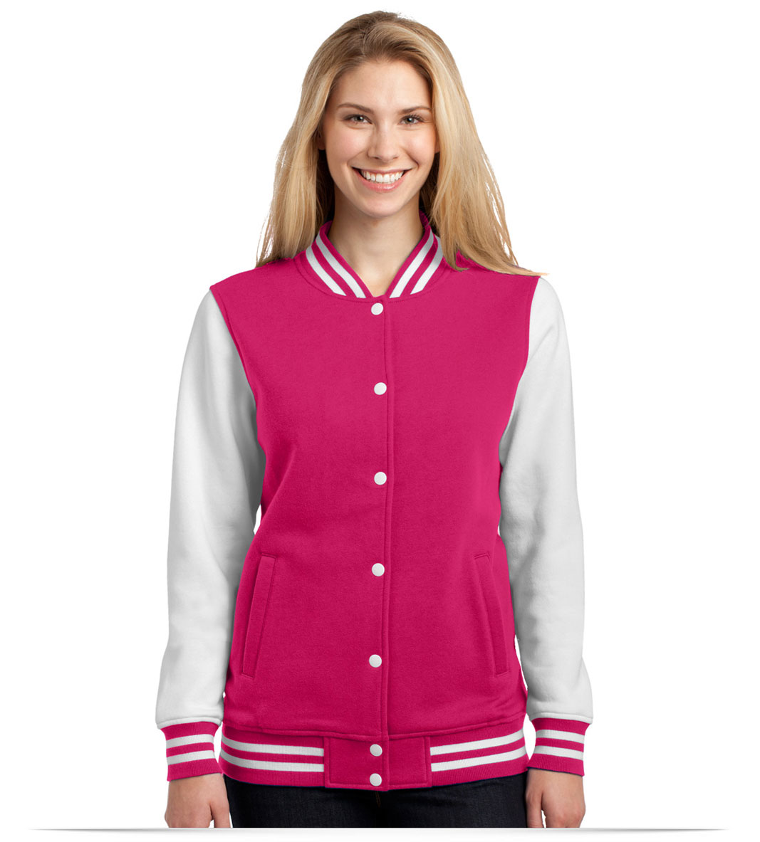 The Sport-Tek Ladies Fleece Letterman Jacket pricing includes your embroidered logo on one location. It comes with 8,000 stitches. Choose up to 6 colors. Additionally, we have a one time logo set-up fee of $65.00. For more info, please call us at (888) 475-5646.