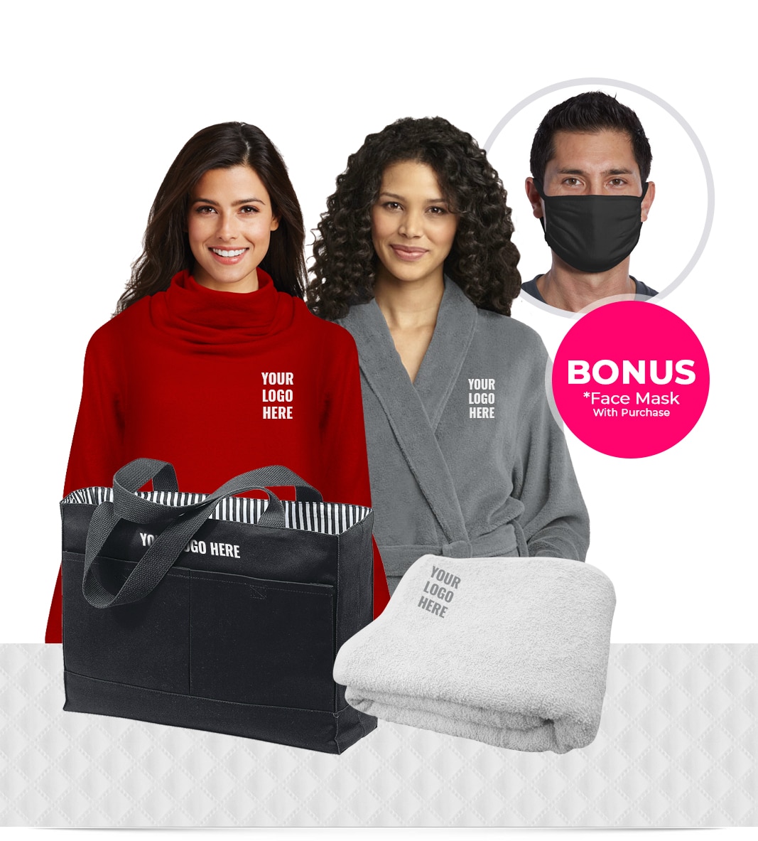 What’s in the customized Valentines Gift Bag Set? A bathrobe, a beach towel, a tote bag, a blanket with sleeves, and a blank face mask as a bonus.